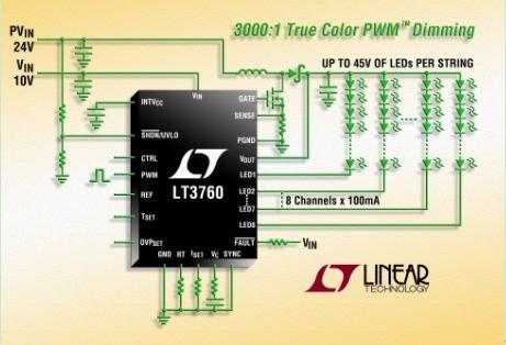 凌力爾特公司 (Linear Technology Corporation) 推出8通道LED驅(qū)動器LT3760,該器件采用一個升壓型DC/DC控制器,每個通道能驅(qū)動高達(dá)45V的100mA LED 串。其內(nèi)部60V、1MHz DC/DC升壓型控制器設(shè)計(jì)成面向多達(dá)80個白光LED的恒定電流LED驅(qū)動器。LT3760用一個12V輸入可以驅(qū)動8個通道,每通道多達(dá)10個串聯(lián)的100mA 白光LED,同時提供超過92% 的效率。其多通道能力使該器件非常適用于中型和大型TFT-LCD背光照明應(yīng)用。其6V至40V 的輸入電壓范圍使該器件非常適用于汽車、航空電子設(shè)備、HDTV 和工業(yè)顯示器應(yīng)用。