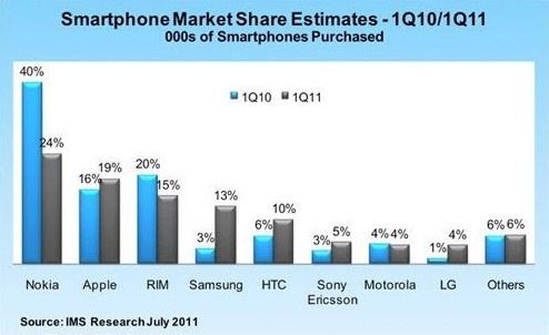 市場研究公司IMS Research表示,在傳統手機市場,三星近年來的表現最為突出。該公司擁有多元化的產品組合,包括使用其自身操作系統bada以及Android和 Windows Mobile操作系統的產品,也包括廣受歡迎的Galaxy系列產品。該公司在智能手機市場的份額從2010年第一季度的3%左右一舉升至2011年第一 季度的13%以上。與此同時,HTC等智能手機廠商的市場份額也大幅上升。