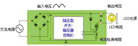 羅姆為了適應(yīng)上述市場(chǎng)需求而在進(jìn)行LED照明用驅(qū)動(dòng)器IC的開發(fā)。為使LED保持一定的亮度點(diǎn)燈,需要有進(jìn)行恒流控制的LED驅(qū)動(dòng)器IC。通常,是從交流電源開始進(jìn)行恒流控制,所以使用降壓型開關(guān)穩(wěn)壓器方式(圖1)。