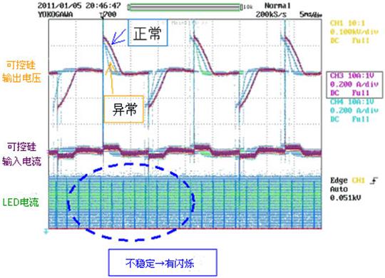可控硅調(diào)光器在可控硅處于導(dǎo)通狀態(tài)時(shí)必須使保持電流持續(xù)流通;一旦保持電流下降,可控硅便關(guān)斷了。由于LED照明燈與原有照明燈相比,功耗極低,所以使可控硅的保持電流下降,調(diào)光器就往往會(huì)因此而不定期關(guān)斷從而發(fā)生閃變(閃爍)現(xiàn)象。(圖5)