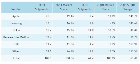 IDC最新市場(chǎng)報(bào)告指出,2011年第二季智能手機(jī)市場(chǎng)表現(xiàn)亮眼,出貨量從去年同期的6440萬(wàn)支成長(zhǎng)至1.065億支,成長(zhǎng)了65.4%。而蘋果市占率達(dá)19.1,居市場(chǎng)首位,其后分別是三星、諾基亞、RIM與HTC宏達(dá)電。
