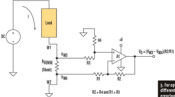 為避免引入這樣的誤差,需要進(jìn)一步增加兩個措施:采用開爾文連接方式與分流電阻相連并加入一個差分輸入放大器。開爾文連接是一種帶有兩條激勵引線和兩條傳感引線的4線連接(圖2)。其中兩條線(W1和W2)是激勵引線,它們將分流電阻連接到該電路的大電流端。另外兩條線(W3和W4)為傳感引線,它們將分流電阻兩端的電壓連接到放大器。這個方式將攜帶負(fù)載電流的導(dǎo)線與測量電路分離開來,并把W1和W2中的電壓降從分流電阻兩端的電壓測量中清除。為了進(jìn)一步有效利用開爾文連接的優(yōu)點(diǎn),還需加入一個差分放大器(如圖3)。