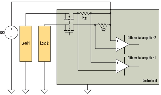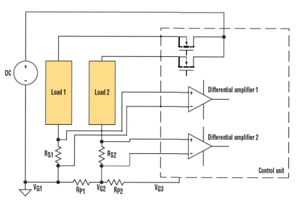 由于低端測量例子可能產(chǎn)生共模問題,這里考慮圖4所示的分布負(fù)載系統(tǒng)。虛線框中的控制單元使用MOSFET來控制輸送到兩個負(fù)載的功率。電源、負(fù)載和控制單元之間的寄生電阻RP1和RP2代表接地引線電阻和連接器電阻之和。在實(shí)際電路中,它們的數(shù)值可能為幾百毫歐。對于這個例子,假設(shè)RP1和RP2為0.2 Ω。差分放大器1和2與圖3中的差分放大器類似。