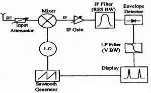 頻譜分析儀從頻譜測試的實現技術上可分為兩類:使用傅里葉變換(FFT)技術的數字頻譜分析儀和使用模擬濾波器的模擬頻譜分析儀(包括并行濾波器頻譜儀和掃頻式頻譜儀)。數字頻譜分析儀使用數值計算的方法處理一定時間周期的信號,可提供頻率、幅度和相位信息,對周期信號和非周期信號均能分析。特點是速度快,精度高,適合分析窄帶信號。模擬頻譜分析儀的掃頻式頻譜分析儀是目前最常見的類型,在掃頻頻譜分析中普遍采用超外差式方式。掃頻式頻譜分析儀可分析穩定和周期變化信號,提供信號幅度和頻率信息,適合寬頻帶寬的快速掃描試驗。Agilent的ESA系列經濟型頻譜分析儀和HP8563等都屬于掃頻頻譜分析儀,其簡化原理框圖見圖1,掃頻頻譜儀實際上是多級混頻結構。這種分析方法最核心的部分是它的混頻器和中頻濾波器?;祛l器將被測信號下變至中頻,然后在中頻上進行處理,得到幅度。本地振蕩器采用掃頻振蕩器,它的輸出信號與被測信號中的各個頻率分量在混頻器內依次進行差頻變換,所產生的中頻信號通過中頻窄帶濾波器后再經放大和檢波,加到視頻放大器作示波管的垂直偏轉信號,使屏幕上的垂直顯示正比于各頻率分量的幅值。本地振蕩器的掃頻由鋸齒波掃描發生器所產生的鋸齒電壓控制,鋸齒波電壓同時還用作示波管的水平掃描,從而使屏幕上的水平顯示正比于頻率。