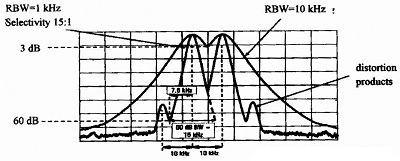 分辨率帶寬(Resolution Bandwidth,RES BW)是中頻濾波器的3 dB帶寬,反映了頻譜儀分辨等幅信號的能力。2個等幅信號之間頻率差為中頻濾波器的3 dB帶寬時,合成響應曲線仍有2個峰值,中間下沉大約3 dB,認為它們是可分辨的,因此稱中頻濾波器的3 dB帶寬為頻譜分析儀的分辨率帶寬(RES BW)。HP/AGILENT頻譜儀定義中頻濾波器的3 dB帶寬為RESBW,有的公司定義6 dB帶寬為RES BW。頻譜分析儀的最小分辨率帶寬反映出頻譜分析儀的檔次高低,經濟型的為1 kHz~5 MHz,多功能中檔型的為30 Hz~5 MHz,高檔型的為1 Hz~5 MHz。