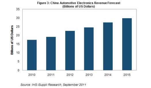 據(jù)IHS iSuppli公司的中國(guó)研究報(bào)告,2011年中國(guó)汽車(chē)電子市場(chǎng)銷(xiāo)售額預(yù)計(jì)將達(dá)到192億美元,比去年的175億美元增長(zhǎng)9.7%。