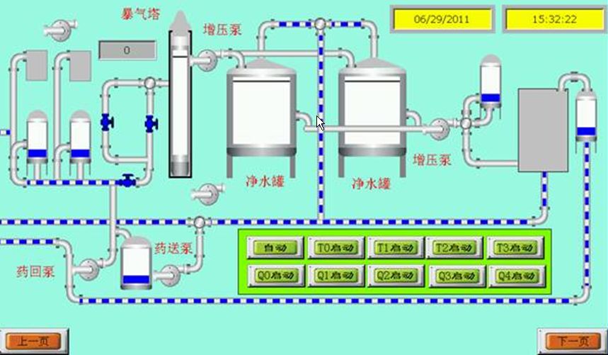 觸摸屏主要功能是顯示和控制制水過程中的數據以及水泵電磁閥的的運行狀態。PLC輸入量有各個閥門的開閉情況和各罐體的液位情況和壓力情況,其中輸入量中的液位是模擬量輸入;輸出量有水泵的啟動停止,電磁閥的開閉,報警等等。圖3為部分觸摸屏的控制界面(初期設計)。
