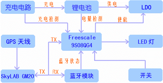 充電IC選用性價比高的EUP8054,最大充電電流可達800mA,并可用外部電阻來調節充電電流;鋰電池容量選擇在1000mAh以上,整機工作電流在50mA左右,因此易實現超過15小時的連續工作時間;藍牙模塊為業內兼容性良好的CSR方案,并且藍牙天線為直接畫在PCB上的微帶線,節省成本;3個LED全部由MCU來控制,可分別指示藍牙狀態、GPS定位狀態及充電狀態等,也可依客戶要求來定做不同的顯示模式。
