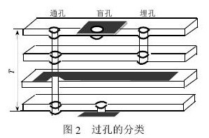 通孔,這種孔穿過整個線路板,可用于實現(xiàn)內部互連或作為元件的安裝定位孔。由于通孔在工藝上更易于實現(xiàn),成本較低,所以一般印制電路板均使用通孔。過孔的分類如圖2 所示。