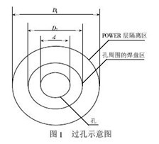 過孔是多層PCB 設計中的一個重要因素,一個過孔主要由三部分組成,一是孔;二是孔周圍的焊盤區(qū);三是POWER 層隔離區(qū)。過孔的工藝過程是在過孔的孔壁圓柱面上用化學沉積的方法鍍上一層金屬,用以連通中間各層需要連通的銅箔,而過孔的上下兩面做成普通的焊盤形狀,可直接與上下兩面的線路相通,也可不連。過孔可以起到電氣連接,固定或定位器件的作用。過孔示意圖如圖1 所示。