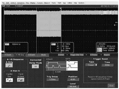 如果B觸發器只限于邊沿檢測,那么這種方法是不可能實現的。在這一過程中,不應忽視復位功能值,因為它決定著如果未能發生相應的A事件和B事件組合,示波器及其用戶不會一直等下去。