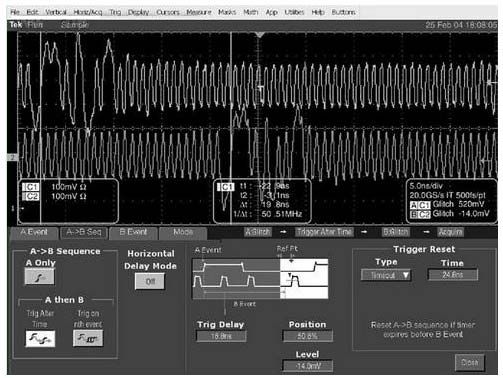 這些快速新協議中的錯誤可能來自多個事件的綜合結果,如邏輯狀態、偏移、瞬變、上升時間問題等。有時,必需規定非常精確的條件范圍,以確定難以捕捉的錯誤。這要求觸發工具系列能夠分析更多的條件。可以采用雙觸發排列來解決這一問題,其中B觸發系統與A系統基本上相同。只是在許多情況下,A條件相對簡單,而在理想情況下,B觸發器應能夠評估比較復雜的一套指標,如只在其它邏輯信號處于規定狀態時才會有效的事件數量等。但是,相關觸發B一直缺乏A觸發系統的靈活性。因此大多數示波器僅提供了非常簡單的B觸發器。