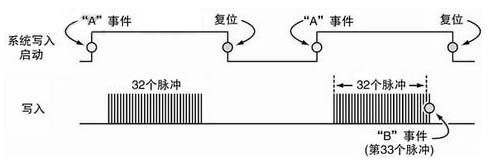 本系統中,讀/寫電路中的一個單元設計成在每個有效系統寫入啟動(WE)周期中執行一串32條寫入命令。圖2描述了較大的周期時間與導致數據寫入的各個脈沖的關系。