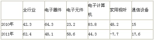 前三季度,電子元件、器件和信息機電行業分別完成投資1133、1615和1495億元,同比增長58.6%、48.1%和120.2%,三個領域投資占全行業的65%,比重比去年提高3個百分點,對全行業投資增長的貢獻率分別達到17%、21%和33%。整機行業投資增長放緩,其中視聽行業完成投資89.5億元,同比下降7.7%, 比重(1.4%)下降1個百分點;通信設備行業完成投資360億元,同比增長17.6%,比重(5.5%)下降2.1個百分點;計算機行業在平板電腦等新產品帶動下,在整機行業中增長相對較快,同比增長44.3%,但仍低于全行業18.1個百分點,其中9月份投資下降20.1%。