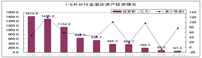 前三季度,電子信息產業500萬元以上項目完成固定資產投資6492億元,投資額超過去年全年水平近500億元,同比增長62.4%,增速高于工業投資35.9個百分點。其中9月份完成投資889.6億元,同比增長35.6%,增速比8月下降35.2個百分點,這是今年以來第二個月月度投資增速低于60%。