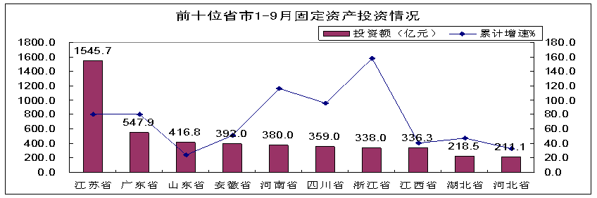 前三季度,東部10省市完成投資3825億元,同比增長74.9%,增速高于去年同期26.3個百分點;江蘇、廣東、浙江、北京投資上升較快,增速均超過80%,特別是江蘇省完成投資1546億元,占全國總投資的近四分之一。中部6省完成投資1557億元,同比增長60%,其中安徽、河南投資增長突出,分別居全國第四、五位,增長51.2%和116.4%。西部12省市完成投資836億元,同比增長53.5%,其中四川省投資359億元,占西部地區的43%,同比增長95.4%。東北三省完成投資274億元,同比下降6.2%。