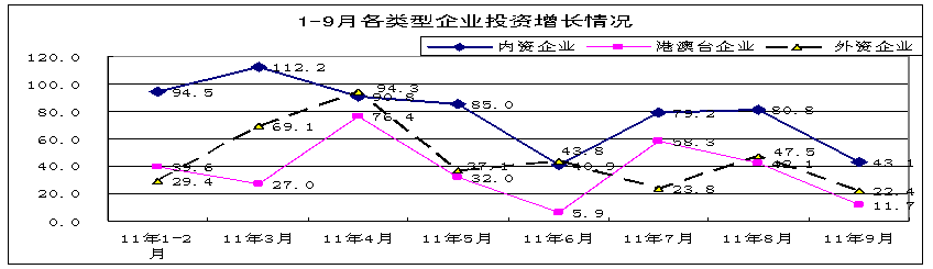 前三季度,內資企業完成投資4821億元,占全行業的74%,同比增長72.9%,高于全行業10.5個百分點,其中私營企業增勢突出,同比增長達107.4%。外商投資和港澳臺企業分別完成投資961和710億元,同比增長42.1%和33.7%,低于全行業20.3和28.7個百分點,其中9月份分別增長22.4%和11.7%。