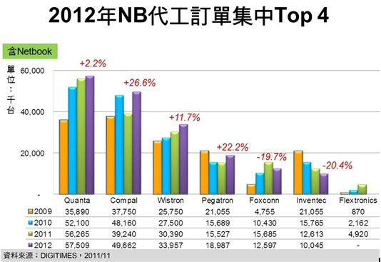 • 2012年NB代工廠將僅前4大業者出貨可成長