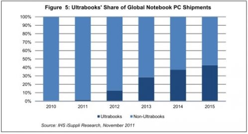 近日消息,據外媒報道,根據IHS iSuppli公司計算平臺部門的研究報告顯示,為了抵擋媒體平板日益增強的威脅,移動PC市場正在力推新型超級本平臺,預計其出貨量到2015年將占到整體筆記本市場的40%以上。