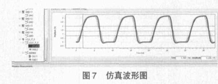 此印制板上100M 的時鐘信號線經(jīng)過設計軟件仿真分析,如圖7 所示,信號傳輸基本沒有受到干擾,達到電訊要求。生產(chǎn)的印制板經(jīng)過調(diào)試顯示,數(shù)字信號對模擬信號的干擾很小,參數(shù)指標良好。