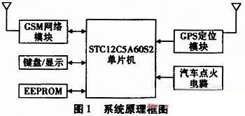 當車主離開車輛時,即可啟動防盜系統(tǒng),首先車主需設(shè)置手機號,以備接收車輛的定位信息,此時,單片機控制GPS模塊,不斷獲取GPS定位數(shù)據(jù),并對獲取的GPS數(shù)據(jù)進行分析,從而獲取包括車輛的經(jīng)、緯度以及速度等信息。系統(tǒng)通過車輛的速度或經(jīng)、緯度的變化來判斷車輛是否被移動,如果車輛被非法移動,單片機將控制GSM模塊將車輛的定位信息通過短消息,以每間隔十分鐘時間發(fā)送到車主指定的手機中,同時,單片機將此信息存儲在EEPROM中,以做將來的證據(jù)使用。車主第一時間知道車輛位置后,即可通過GSM遠程網(wǎng)絡(luò)控制防盜系統(tǒng),切斷車輛的點火電路,使車輛熄火。同時,車主將車輛定位信息提供給警方,盡快找回自己的車輛。系統(tǒng)工作原理框圖見圖1。