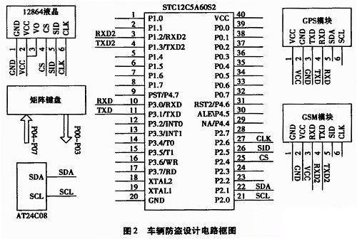 人機接口包括矩陣鍵盤和液晶顯示部分,主要用于實現(xiàn)預(yù)置的手機號碼的輸入、顯示和防盜功能的開啟與關(guān)閉功能。存儲器采用HC總線的EEPROM AT24C08,其為非易失性存儲器,存儲的數(shù)據(jù)可保存100年以上,并可進行上萬次擦寫。單片機將GPS上接收來的數(shù)據(jù)進行解析后,所獲得的車輛所處的經(jīng)、緯度,速度等信息保存在該存儲器中,為以后做為公安機關(guān)的證據(jù)依據(jù)。