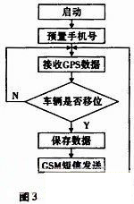 自動跟蹤系統(tǒng)軟件由界面程序、信號處理程序和控制信號輸出程序等三部分組成。信號處理程序?qū)崿F(xiàn)了單片機對GPS信號的采集、解析等以及通過GSM網(wǎng)絡(luò)向用戶發(fā)送車輛定位信息等,是軟件程序的重點;界面程序主要完成手機號設(shè)置、鍵盤處理、液晶顯示等,實現(xiàn)了與用戶良好的溝通;控制信號程序?qū)崿F(xiàn)對GSM信號的接收與分析,完成對車輛的點火開關(guān)的控制;其軟件總框圖如圖3所示。