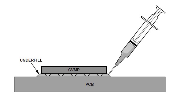 焊接完成后,由于焊料厚度有限,封裝與PCB之間會有一個較窄的空間。已經證明,用底部填充材料填充此空間可以改善焊接抗疲勞壽命,因為它能減輕這種封裝(引腳為嵌入式,不能用來釋放應力)中焊點應力的影響。