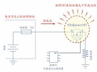 圖1 說明了一個出現(xiàn)故障的powerFET可能并不會產(chǎn)生一個完全硬短路的過流情況,而是產(chǎn)生阻性短路,因此通過I2R發(fā)熱造成不安全的溫度。在這種情況下,所形成的電流可能并沒有高到使一個標準保險絲熔斷并阻止印制電路板上的熱失控。