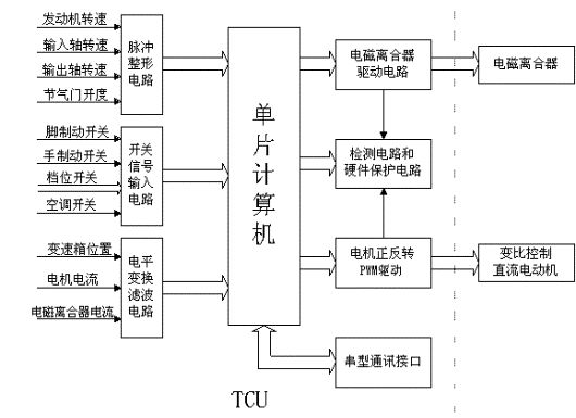TCU的基本結(jié)構(gòu)如圖2所示,它由單片機、檢測電路、驅(qū)動電路、電源電路以及通訊電路等部分組成。