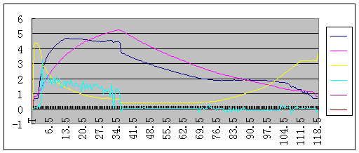 圖5為汽車速度從零加到120KM/H后又由120KM/H減到零時,位置傳感器與輸入軸轉(zhuǎn)速、輸出軸轉(zhuǎn)速和電機電壓之間的關(guān)系曲線。由圖可知,當汽車速度在從零加到120KM/H過程中,位置傳感器變比由最大開始下調(diào)直到變?yōu)樽钚?,此時對應(yīng)電機反轉(zhuǎn)。當車速由120KM/H開始下降時位置傳感器先保持不變,此時電機不轉(zhuǎn),同時輸入軸轉(zhuǎn)速和輸出轉(zhuǎn)速成比例的下降,當車速達到一定的值時位置傳感器速比由最小開始上調(diào)直到為最大值,此時電機反轉(zhuǎn)(因測試時采用的電流傳感器為單方向的,所以圖中沒有反映出反向電流)。輸入軸轉(zhuǎn)速和輸出軸轉(zhuǎn)速不成比例的下降直至為零。從圖5可以看到車速在上升時,位置傳感器速比的測試值不斷地減小(對應(yīng)的轉(zhuǎn)速比增大)。反之,車速在下降的過程中,當車速小于某一值時測試值增加。從而實現(xiàn)了變速箱變比的自動調(diào)整。