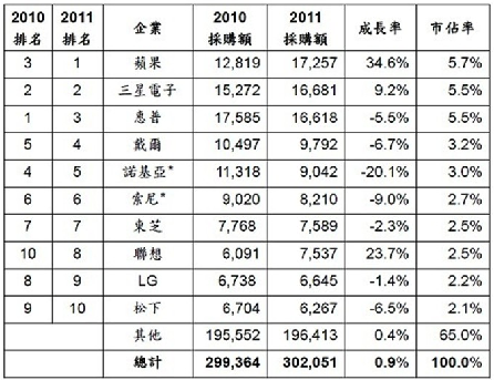 Gartner指出,蘋果在智慧型手機(jī)市場的市占率提升,平板媒體在2011年亦有亮眼業(yè)績。雖然2011年DRAM價格急遽下滑,許多PC業(yè)者緊縮整體半導(dǎo)體的需求,但隨著MacBookAir的成功,使蘋果PC事業(yè)對半導(dǎo)體晶片的需求增加。