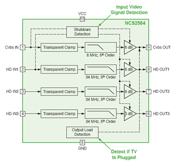 視頻信號放大器包括NCS2566、NCS2564、NCS2584、NCS2563、NCS2553、NCS2561、NE592x8和NE592x14等。圖1是NCS2584的框圖,可以看到,其關(guān)斷檢測用來進行輸入視頻信號檢測,輸出負載檢測用來檢測是否有電視接上插座。