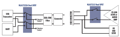 安森美半導體的USB開關(guān)器件包括NLAS7242、NLAS4717EP、NLAS7213、NCN9252和NLAS8252等,主要功能是處理USB 2.0高速信號,具有3.0 V電壓時6.5Ω的典型導通阻抗、500 MHz帶寬,以及低串擾(250 MHz時為-45 dB),采用業(yè)界最小封裝。圖2是NLAS7222A雙SPDT和NLAS7213雙SPST框圖。