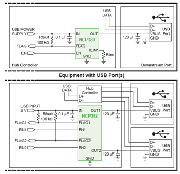 USB負載開關(guān)提供用于USB主機的過流保護(OCP)。安森美半導體的相關(guān)產(chǎn)品有NCP380、NCP382單、雙通道負載開關(guān)。這些器件可防止采用USB的設(shè)備端口因短路或過載事件而損壞,其短路檢測時間僅為1微秒。這些器件具有精確的電流限制閾值、固定或可調(diào)電流限制(500 mA至2.1 A),支持在電流平板電腦充電,獲得了UL和CB認證。