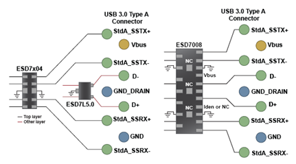 此外,還有針對消費產(chǎn)品的USB 3.0器件(ESD7008、ESD7104、ESD7004和ESD7L)。這些器件符合電容低于0.5 pF要求,提供最低0.15 pF的超低電容,采用穿越型(flow-through)布線,提供領(lǐng)先業(yè)界的低鉗位電壓。