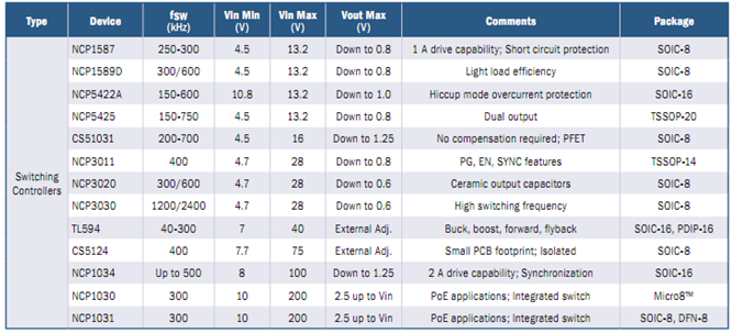 安森美半導體的開關(guān)控制器的關(guān)鍵特性包括寬輸入電壓范圍、緩沖的外部高于1.25 V的電壓參考、電源良好+啟用/禁用引腳、外部同步和輸出過壓和欠壓保護。根據(jù)型號不同,具有支持短路保護、高輕載能效、斷續(xù)(hiccup)模式過流保護、雙輸出、無需補償、PG/EN/SYNC功能、使用陶瓷輸出電容、高開關(guān)頻率、降壓/升壓/正前/反激、支持小PCB面積、支持隔離、PoE應用、集成開關(guān)等特性,詳見下表。