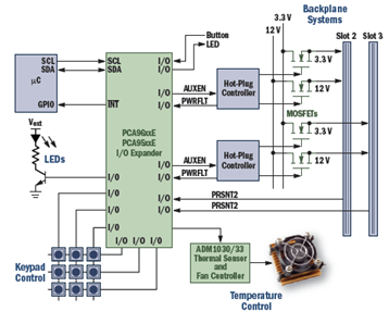 安森美半導體的級聯(lián)I/O擴展器采用I2C和SMBus接口和1 MHz的SCL時鐘頻率,具有30 mA SDA灌電流能力,可用于背板系統(tǒng)等應用,實現(xiàn)鍵盤控制、溫度控制、熱插拔控制等功能。圖6是背板系統(tǒng)的各種控制功能。