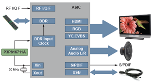 在機頂盒的DDR存儲器EMI抑制應用中,使用P3P816711A可降低1倍LVCMOS峰值EMI,可30 MHz的輸入?yún)⒖紩r鐘,并提供30 MHz ± 0.3%輸出時鐘。