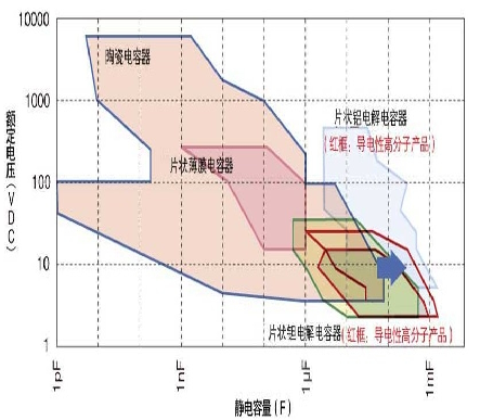 本圖顯示了各種電容器的產品范圍。片狀獨石陶瓷電容器迅速向大容量化方向推進,其范圍逐漸擴大。而鋁電解電容器和鉭電解電容器也在努力向高耐壓化和大容量化方向發展,以追趕片狀獨石陶瓷電容器。