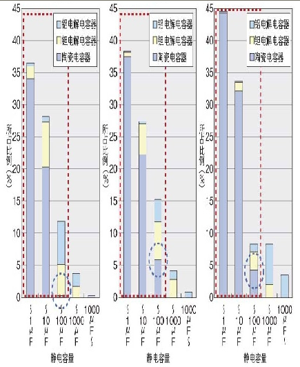 圖2:大容量產品的所占比例按照不同的靜電容量對電容器的總需求進行了統計,分別明確了片狀獨石陶瓷電容器、鋁電解電容器、鉭電解電容器各自所占比例。