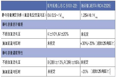 在靜電容量的測定上,新規格改為在施加1.25V直流電壓和0.1Vrms交流電壓的狀態下對容量進行測定。而原來的“JIS C 5101-22”規格并不要求施加直流電壓,只是要求在施加0.5~1Vrms交流電壓的狀態下對容量進行測定。