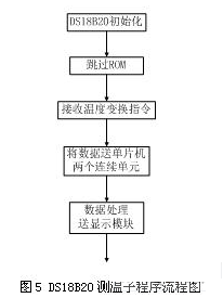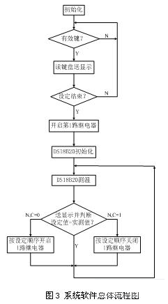 系統軟件總體流程圖如圖3所示。系統上電后,首先進行初始化,對寄存器和I/O端口進行設置。當檢測到按鍵有效信號,讀取按鍵數據,傳遞給單片機并送顯示模塊顯示,鍵盤設定結束后置標志位,單片機檢測到此信號后,開啟第1路繼電器進行加熱。此時初始化數字溫度計DS18B20進行溫度測量,并將測得實時溫度數據送單片機處理,再由顯示模塊顯示。DS18B20每測完一次溫度后,就將實測溫度值與設定溫度值的上限和下限進行比較,如實測溫度高于設定溫度的上限,轉到繼電器關閉處理程序,檢測每一路繼電器的開、關狀態,按照第3路、第2路、第1路的順序關閉繼電器(每執行1次關閉1路繼電器);如實測溫度低于設定溫度的下限,轉到繼電器開啟處理程序,檢測每一路繼電器的開、關狀態,按照第1路、第2路、第3路的順序開啟繼電器(每執行1次開啟1路繼電器)。在之后的系統工作中始終循環測溫~溫度值比較~開啟或者關閉繼電器這樣的流程,以達到對加熱區域溫度恒溫控制的目的。