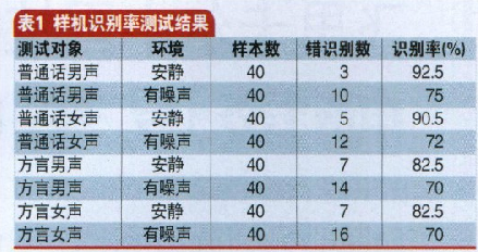 本系統的樣機實驗主要是測試非特定人的語音識別率和模擬開關動作的準確率。由于汽車音響的語音詞條為2~4個字,語音識別率實驗內容為車載音響常用2字詞條指令18條、3字詞條指令12條、4字詞條指令10條,實驗對象為6人4男、2女(普通話和方言),實驗環境為噪聲干擾環境和相對安靜環境,樣機測試結果如表1所示。