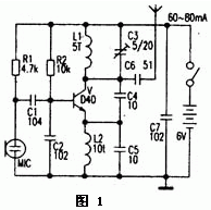 圖1是較為經典的1.5km單管調頻發射機電路。電路中的關鍵元件是發射三極管,多采用D40,D5O,2N3866等。工作電流為60--80mA。但以上三極管難以購到,且價格較高,假貨較多。筆者選用其他三極管實驗,相對易購的三極管C2053和C1970是相當不錯的,實際視距通信距離大于1.5km。筆者也曾將D40管換成普通三極管8050,工作電流有60--80mA,但發射距離達不到1.5km,若改換成9018等,工作電流更小,發射距離也更短,電路中除了發射三極管以外;線圈L1和電容C3的參數選擇較重要,若選擇不當會不起振或工作頻率超出88--108MHz范圍。其中L1,L2可用0.31mm的漆包線在3.5mm左右的圓棒上單層平繞5匝及10匝,C3選用5-20pF的瓷介或滌綸可調電容。實際制作時,電容C5可省略,L2上也可換成10-100mH的普通電感線圈。若發射距離只要幾十米,那么可將電池電壓選擇為1.5-3V,并將D40管換成廉價的9018等,耗電會更少,也可參考《電子報》2000年第8期第五版(簡易遠距離無線調頻傳聲器)一文后稍作改動。圖1介紹的單管發射機具有電路簡單,輸出功率大,制作容易的特點,但是不便接高頻電纜將射頻信號送至室外的發射天線,一般是將0.7--0.9m的拉桿天線直接連在C5上作發射的,由于多普勒效應,人在天線附近移動時,頻漂現象很嚴重,使本來收音正常的接收機聲音失真或無聲。若將本發射機作無線話筒使用,手捏天線時,頻漂有多嚴重就可想而知了。
