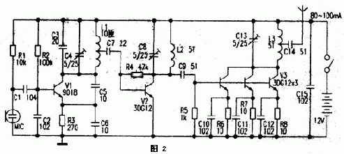 圖2為2km調頻發射機電路。本電路分為振蕩、倍頻、功率放大三級。電路中V1、C2--C6、R2、R3及L1組成電容三點式振蕩器,其振蕩頻率主要由C3、C4和L1的參數決定,其振蕩頻率為44~54MHz,該信號從L1的中心抽頭處輸出,再經過C7耦合至V2放大,由C8和L2選出44~54MHz的二倍頻信號,即88-108MHz,,此信號由C9耦合至V3進行功率放大,V3由3只3DGl2三極管并聯組成,可擴大輸出功率。該電路正常工作時,電流約80-100mA。組成V3的三只3DG12可加上適當的散熱片,以防過熱。制作時L1~L3用0.31mm漆包線在直徑3.5mm圓棒上單層平繞。