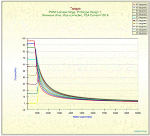像上圖一樣的繪出一個電機的轉(zhuǎn)矩——轉(zhuǎn)速曲線并非輕而易舉之事,需要每個轉(zhuǎn)速下優(yōu)化超前角來得到。MotorSolve可以快速設(shè)置多種轉(zhuǎn)速和超前角的組合方式,來繪制上述圖形。通過這些曲線的包絡(luò)線,能得到轉(zhuǎn)矩——轉(zhuǎn)速曲線和優(yōu)化的超前角。恒功率變速內(nèi)嵌磁鋼式永磁電機的曲線如上圖所示。