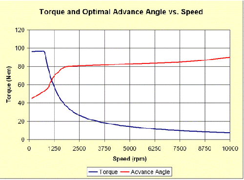 這幅圖中可以提取每個轉(zhuǎn)速下優(yōu)化超前角的峰值轉(zhuǎn)矩。當(dāng)電機超過恒轉(zhuǎn)矩區(qū)域(大概875轉(zhuǎn)/分)后,弱磁的優(yōu)勢突顯出來。