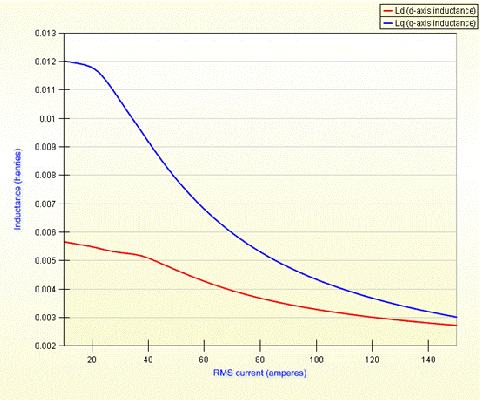 內(nèi)嵌磁鋼式永磁電機的調(diào)速范圍寬是由于其具有較高的凸極比(d軸電感與q軸電感之比)。MotorSolve能準(zhǔn)確地描述由磁路飽和引起的電感的非線性規(guī)律。上圖表明了Ld 和Lq是電流的函數(shù)。[page]