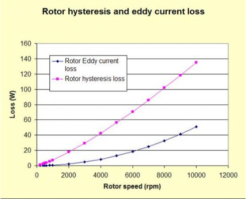 銅損是電機整體損耗中關(guān)鍵的部分,MotorSolve先進的損耗計算能力能計算出基于元件級的磁滯和渦流損耗。上圖表明轉(zhuǎn)子的磁滯和渦流損耗是轉(zhuǎn)速的函數(shù)(或等價的是頻率的函數(shù))。渦流趨勢呈現(xiàn)拋物線型,而磁滯損耗與功率曲線規(guī)律相似。